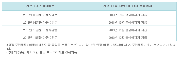 2019년 9월부터는 아동수당 대상자를 확대해서 작년 기준 만 6세 미만에서 만 7세 미만 자녀를 둔 모든 가정으로 지급 대상에 대해서 확대 시행하게 됩니다.
