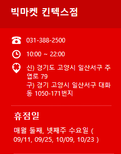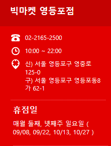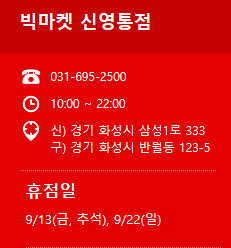 빅마켓 신영통점휴무일: 매월 둘째, 넷째주 일요일 ( 09/13, 09/22 )