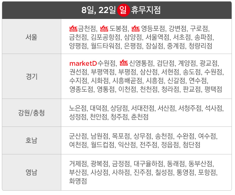 금천점, 양평점, 은평점, 월드타워점, 중계점, 청량리점, 서초점, 잠실점, 송파점, 서울역점, 삼양점, 김포공항점, 구로점, 강변점