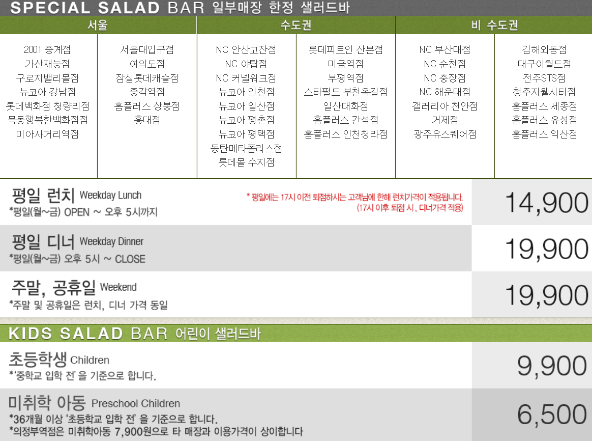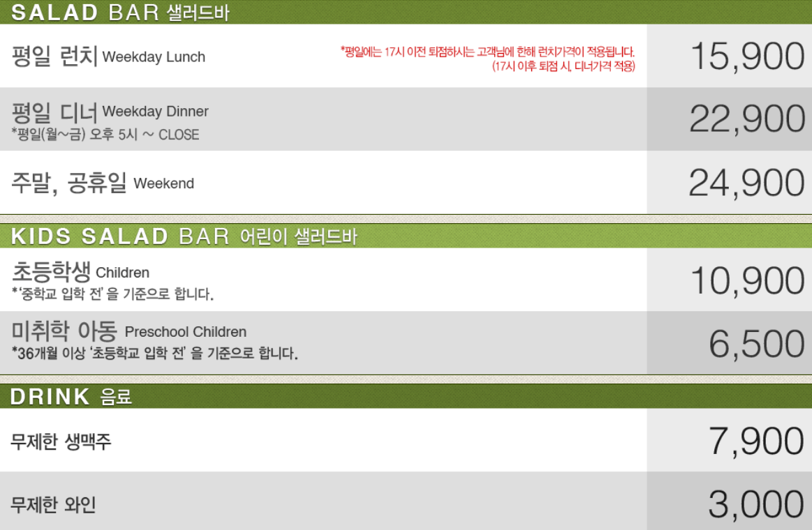 모든 빈티지 컨셉의 세련되고 캐쥬얼한 공간에서 즐기는 100여가지의 신선한 샐러드가 있습니다. 갓구운 피자 풍성한 파스타까지 즉석 제공 된다고 합니다.
