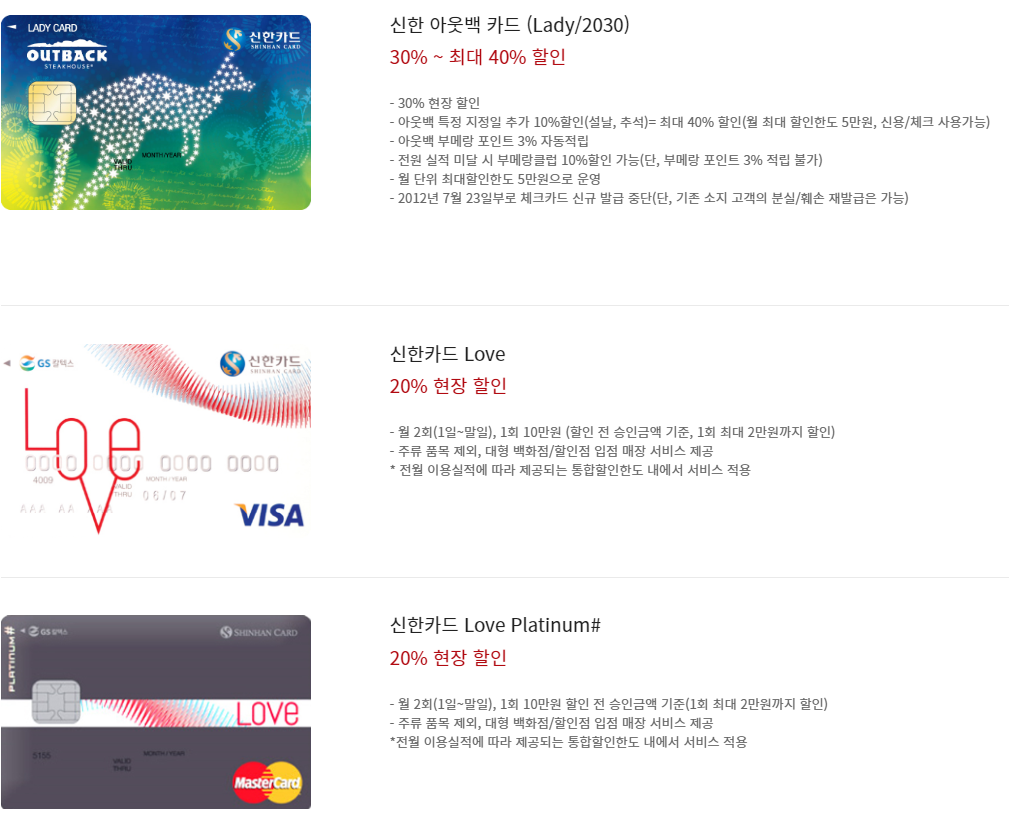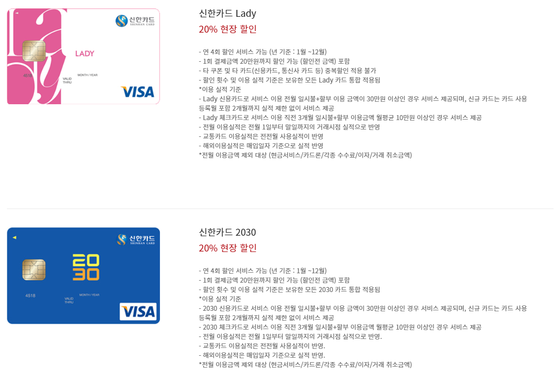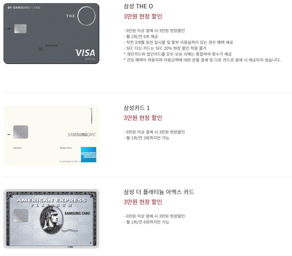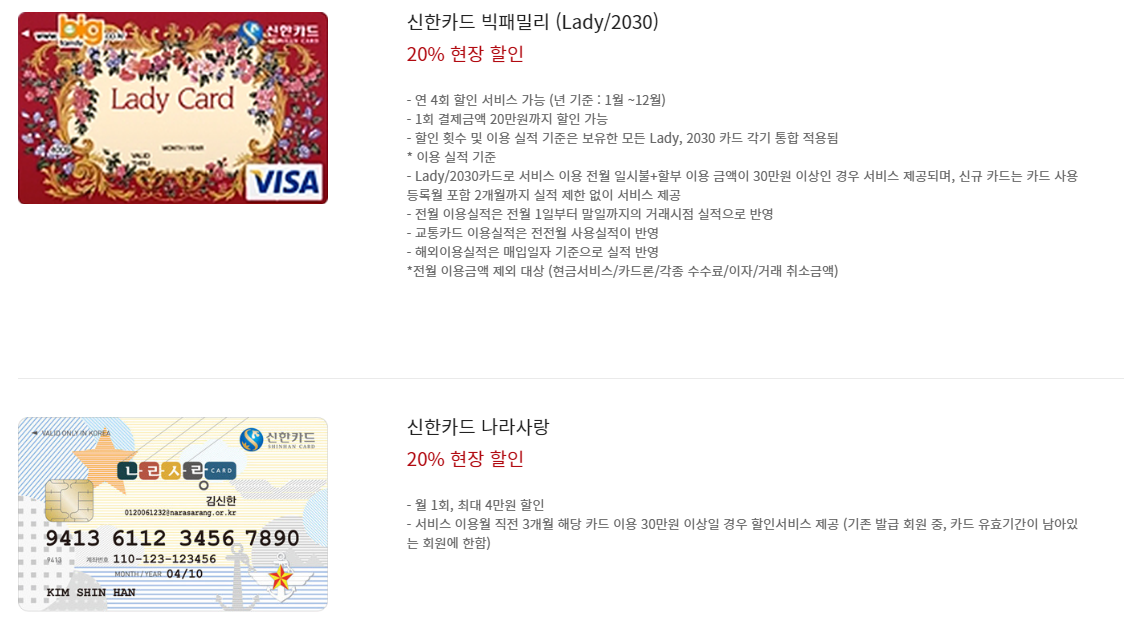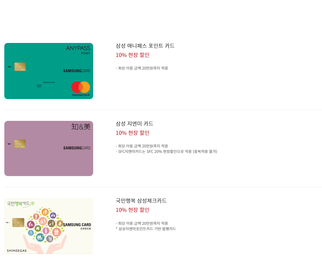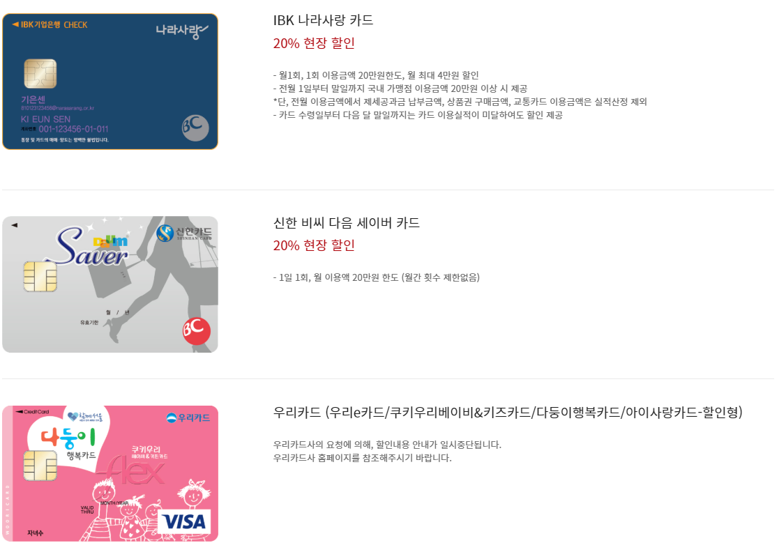 할인 서비스 안내는 각 제휴카드 별로 할인가능 횟수, 전월 실적, 최대 할인금액, 상세 조건에 따라서 할인이 제한될 수 있습니다. (모바일 카드는 적용불가)