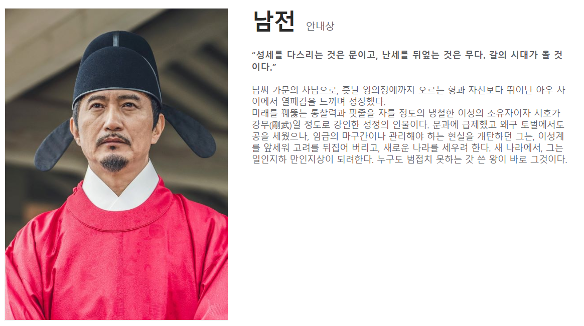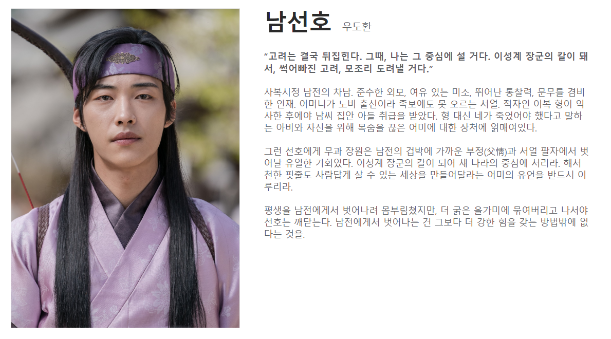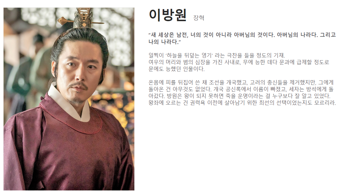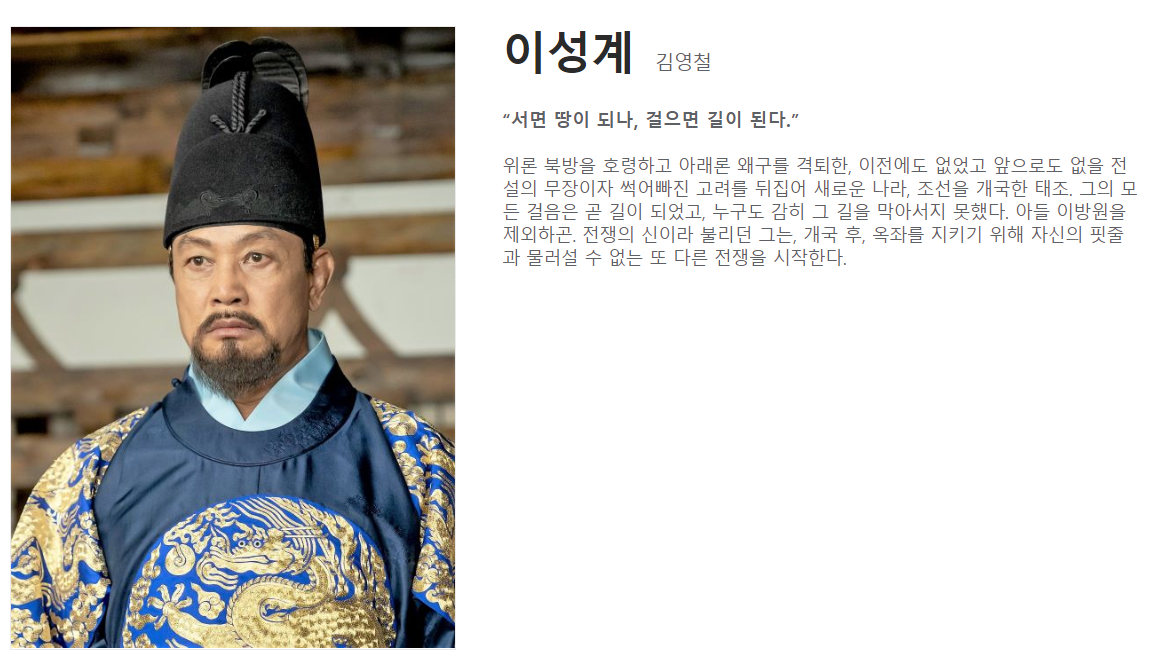 고려 말 조선 초를 배경으로 각자의 신념이 말하는 ‘나의 나라’를 두고 서로에게 칼끝을 겨누고 권력, 수호에 관한 욕망을 폭발적으로 그려낸 액션 사극입니다.
