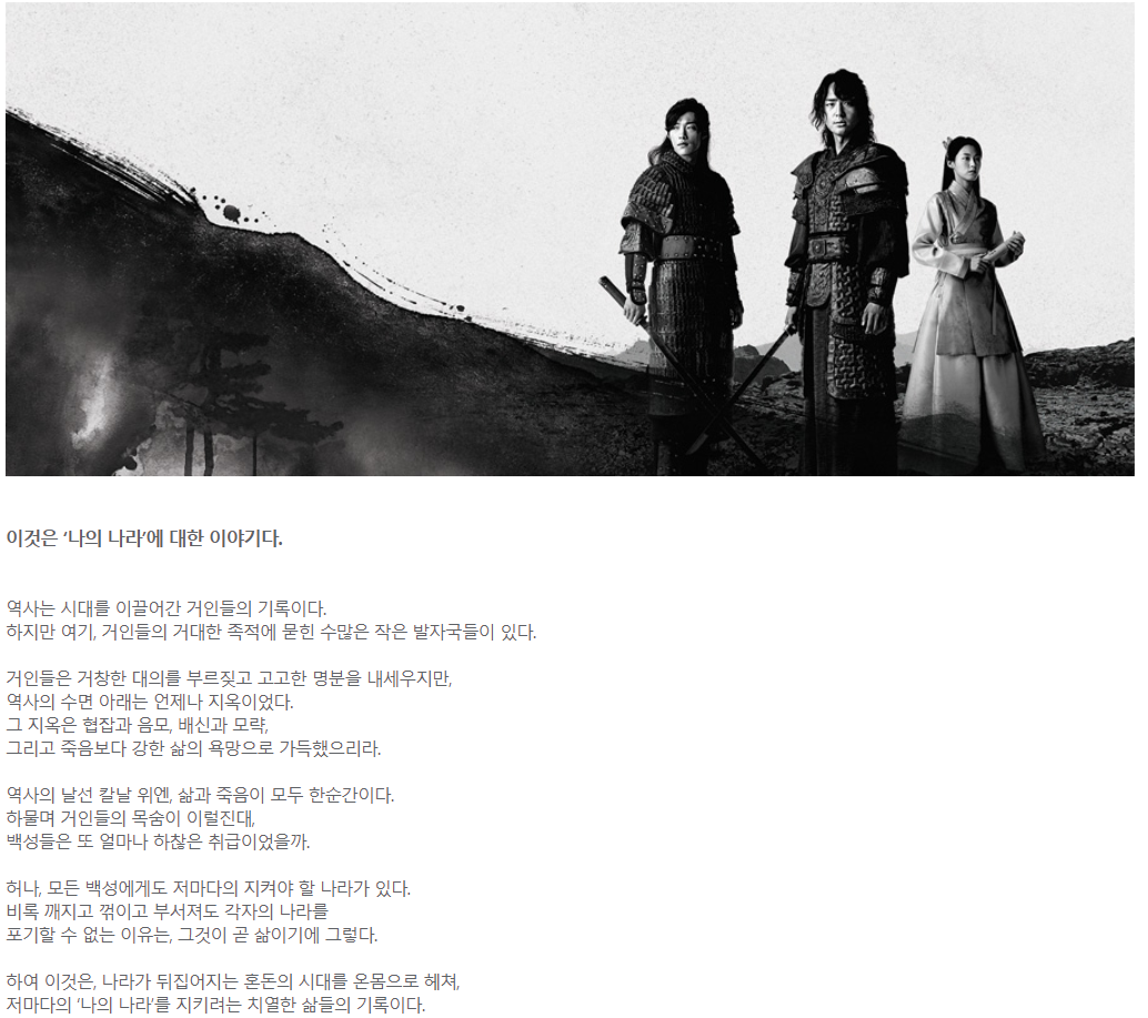 '나의 나라' 10월 4일 (금) 밤 10시 50분 첫 방송 ( 20부작 ) 에 대해서 많은 사람들이 기대를 하고 있습니다.