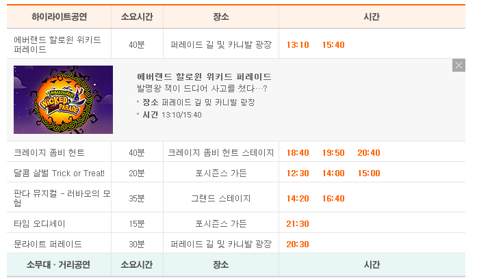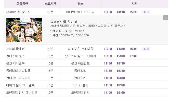 공연 일정은 매주 수요일에 최종 업데이트 되므로 자세한 내용은 에버랜드 사이트-> 운영시간에서 확인이 가능합니다.