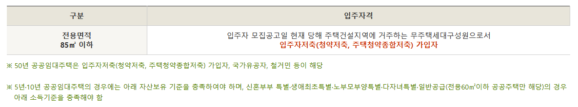 주택 건설지역에 거주하는 무주택세대 구성원으로 되어있어야 되며 청약저축 가입자로 일정 수준의 자산 보유 기준 등 입주조건이 들어가야 합니다.