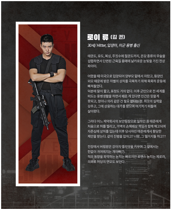 입양아이자 미군 용병 출신이며 인간병기에 버금가는 전투력을 갖춘 보안전문가이자 파이터입니다.