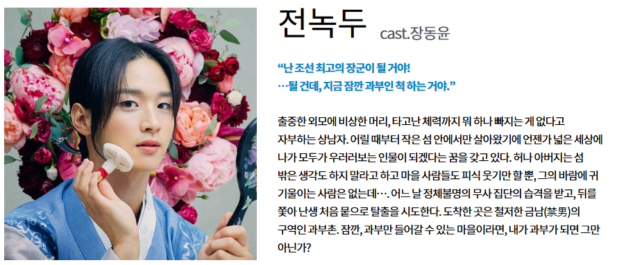미스터리한 과부촌에 여장을 하고 잠입한 전녹두와 앞으로 기생이 되기 싫은 반전 있는 처자 동동주의 발칙하고 유쾌한 조선판 로맨틱 코미디를 그린 드라마입니다.