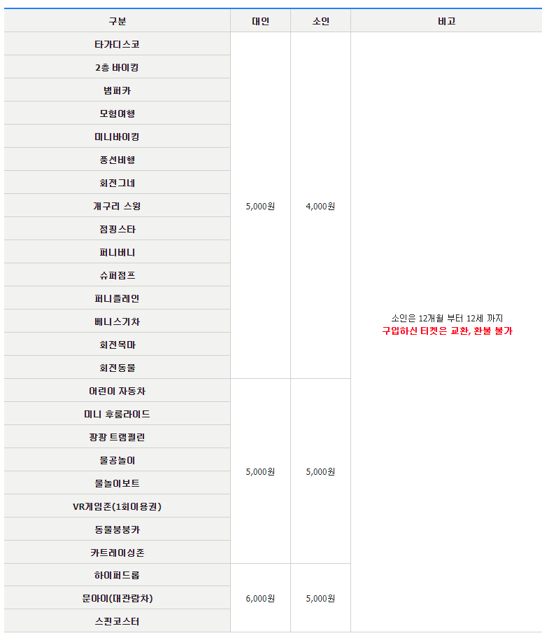 월미도 월미테마파크 이용요금