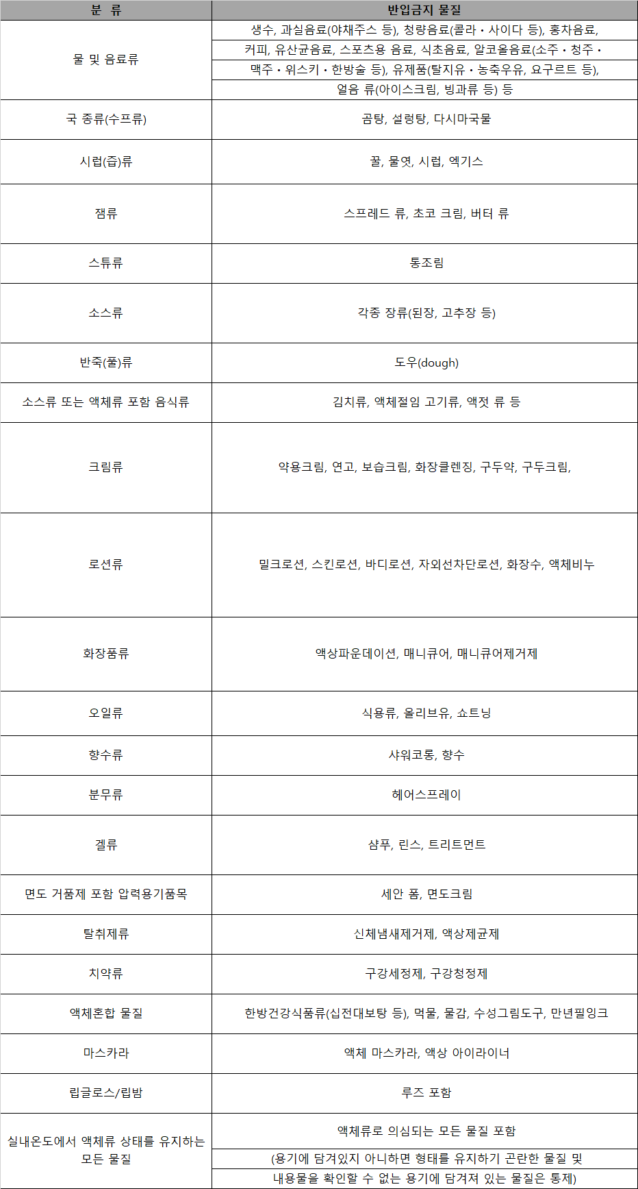 액체류 기준을 아직도 모르시겠죠? 그래서 확실하게 반입금지 물품에 대해서 표로 정리를 해봤습니다.