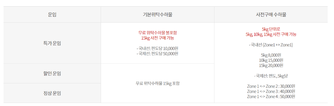 5kg 단위로 5kg, 10kg, 15kg까지 사전 구매할 수 있고, 해당 노선에 따라 금액이 다릅니다.
