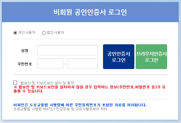 자동차 단속위반을 조회하기 위해선 공인인증서 로그인이 필요합니다.