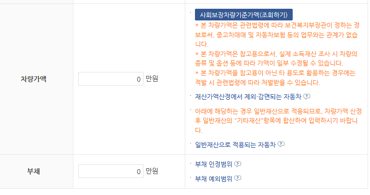 차량가액, 부채 정보를 기재해주시면 됩니다.