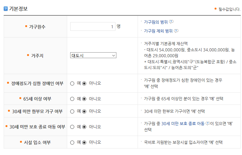 기본정보 (가구원수, 거주지, 장애정도가 심한 장애인 여부, 65세 이상 여부, 30세 미만 한부모 가구 여부, 30세 미안 보호 종료 아동여부, 시설입소여부) 를 기재해주시면 됩니다.