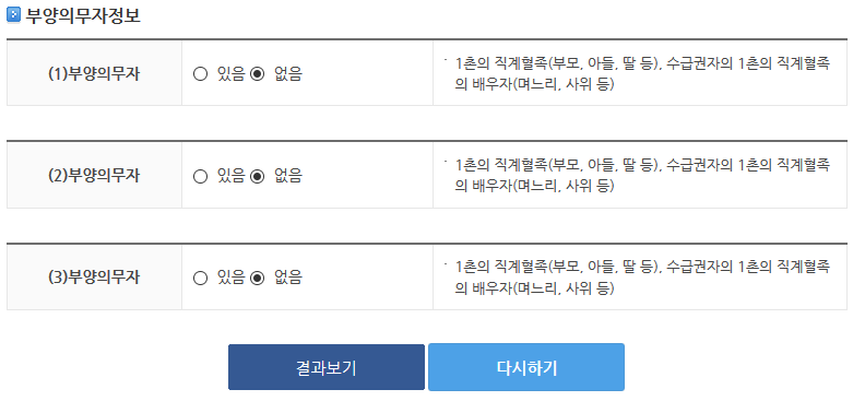 부양의무자정보에 대해서 정보를 기재해주시면 마무리가 됩니다.