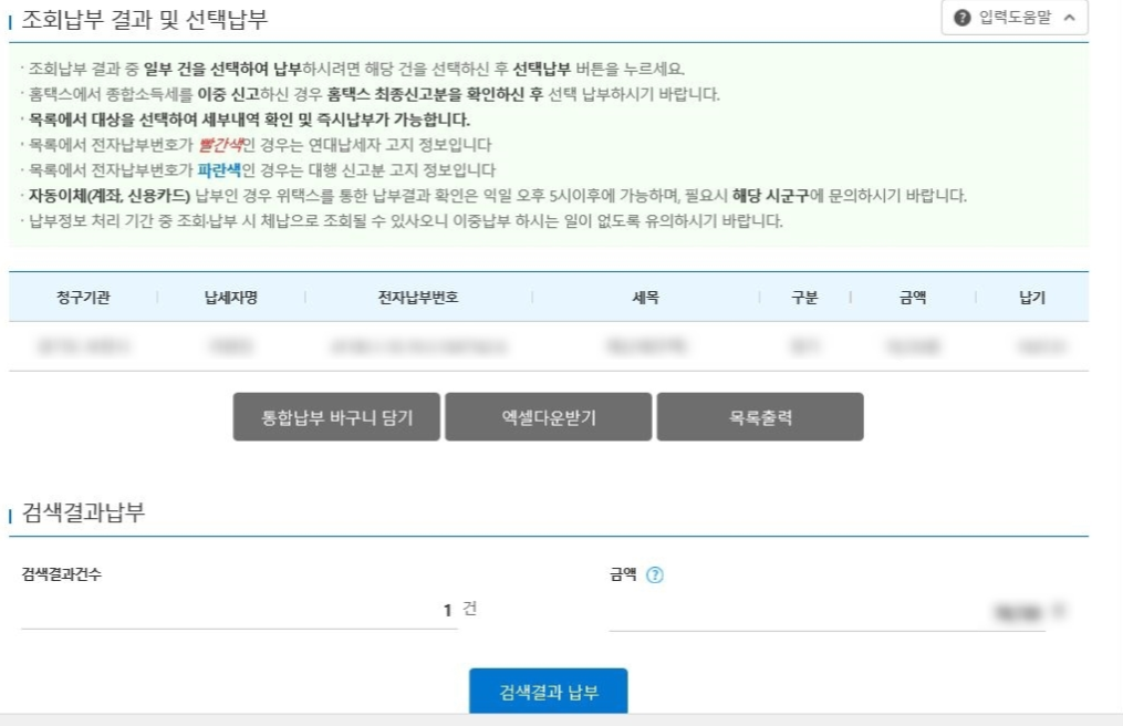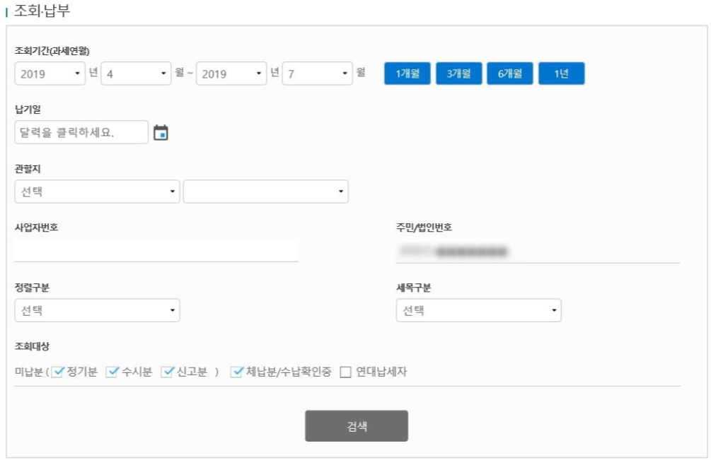 4. 조회기간, 납기일, 관할지, 주민번호 확인 후 검색 해주세요
