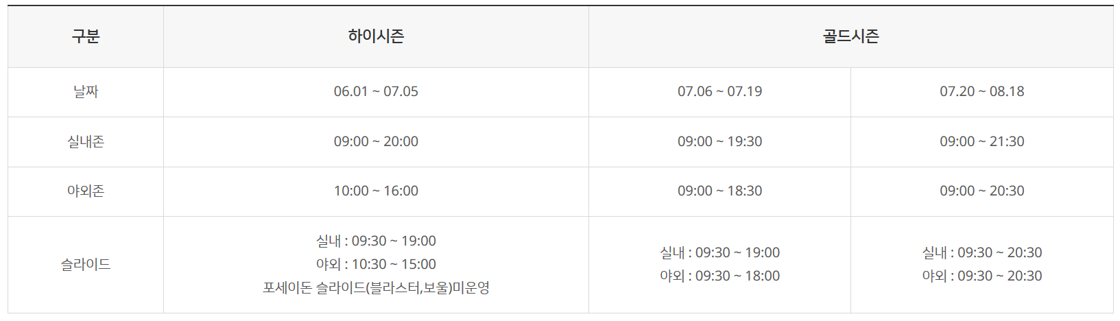 날짜별로 실내존, 야외존, 슬라이드존 입장시간과 마감시간이 다르니 참고하시면 될 듯 합니다.
