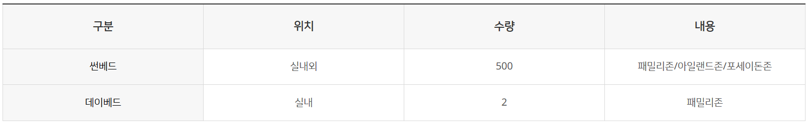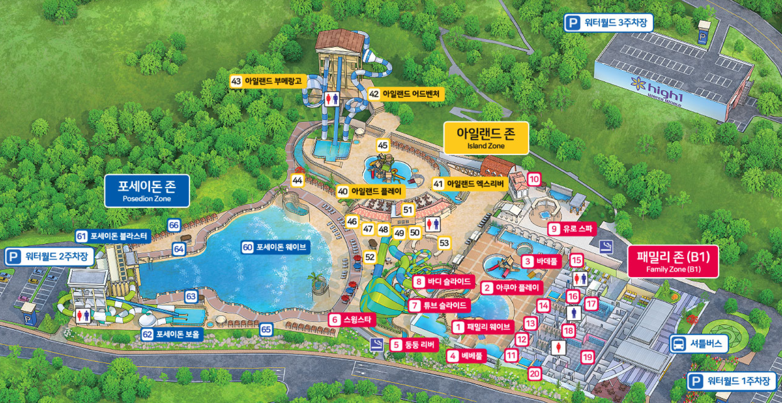 유료스파, 바데풀, 패밀리존, 아일랜드존, 포세이돈존 등등 다양한 놀이시설이 많이있는게 눈에 확 띄네요