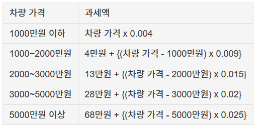 자동차세 계산방법을 확인하니 차량가격에 따라서 과세액이 정해지는걸 볼 수 있습니다.