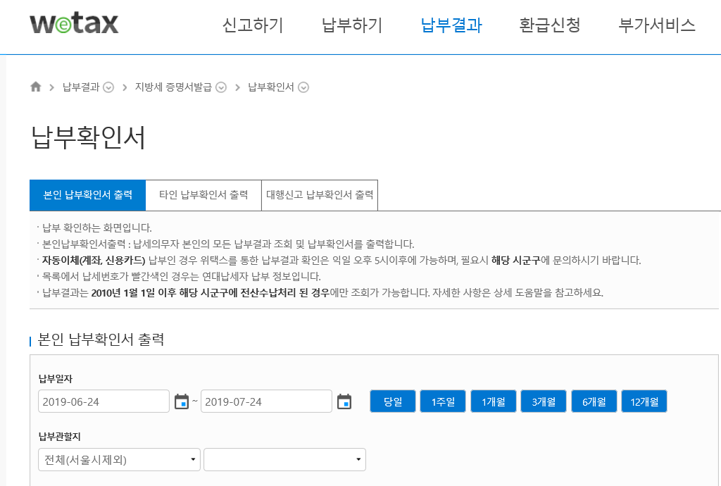 납부결과에서 납부확인서를 클릭해주시면 결제된 내역에 대해서 조회가 가능합니다.