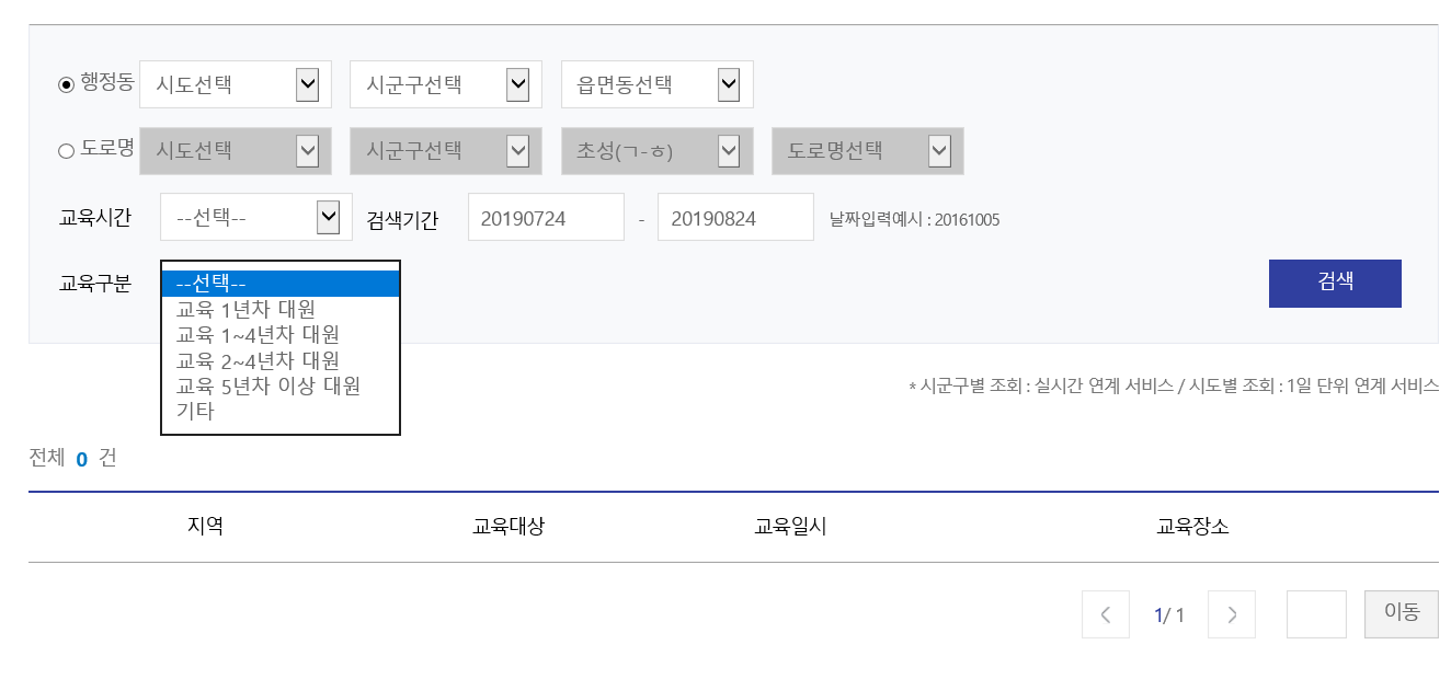 행정동, 도로명, 교육시간, 교육구분을 선택하여 검색을 해주시면 예정 교육일정이 나옵니다.
