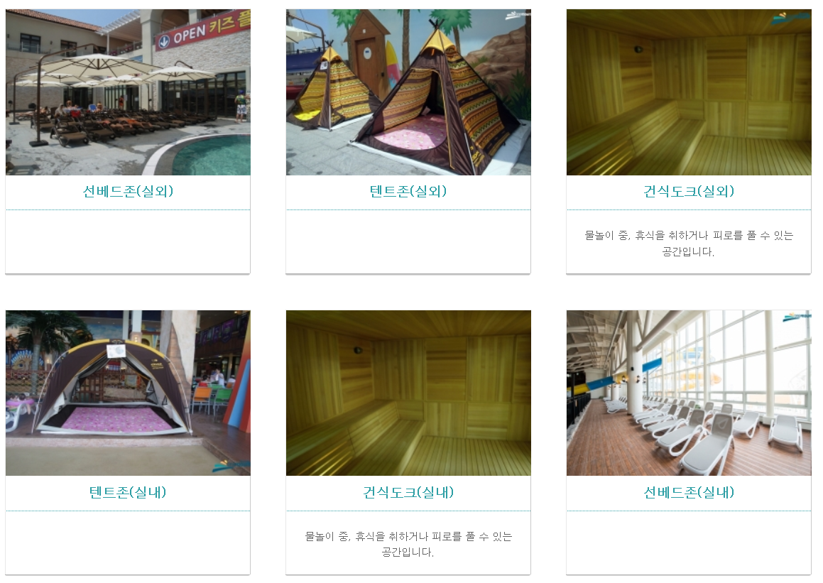 원마운트 워터파크 부대시설은 선베드존, 텐트존, 건식도크 다양하게 있습니다.